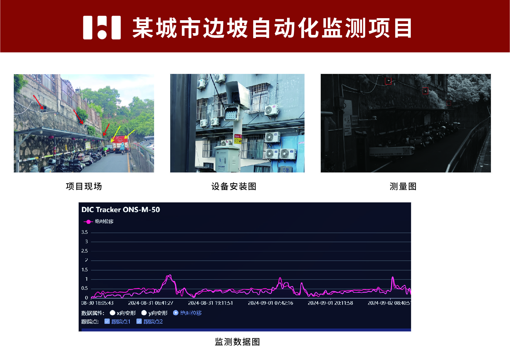 • 非接触式监测:基于斜光轴DIC视觉技术,无需复杂布线,远距离精准感知沉降、裂缝、位移、振动等变化。